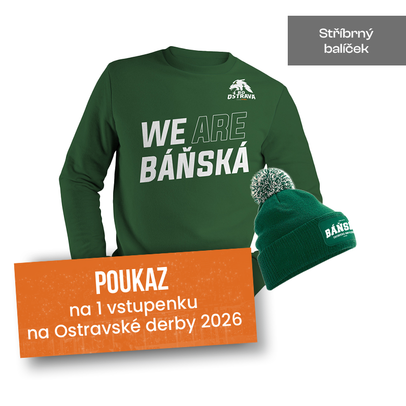 Balíček obsahuje: Mikinu WE ARE BÁŇSKÁ, Kulich a 1x Vstupenku na Ostravské hokejové derby 2026. Původní cena:1100,-