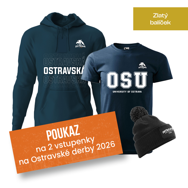 Balíček obsahuje: Mikina Ostravská, Tričko OSU, Kulich a 2x vstupenku na Ostravské hokejové derby 2026. Původní cena: 1 600,-